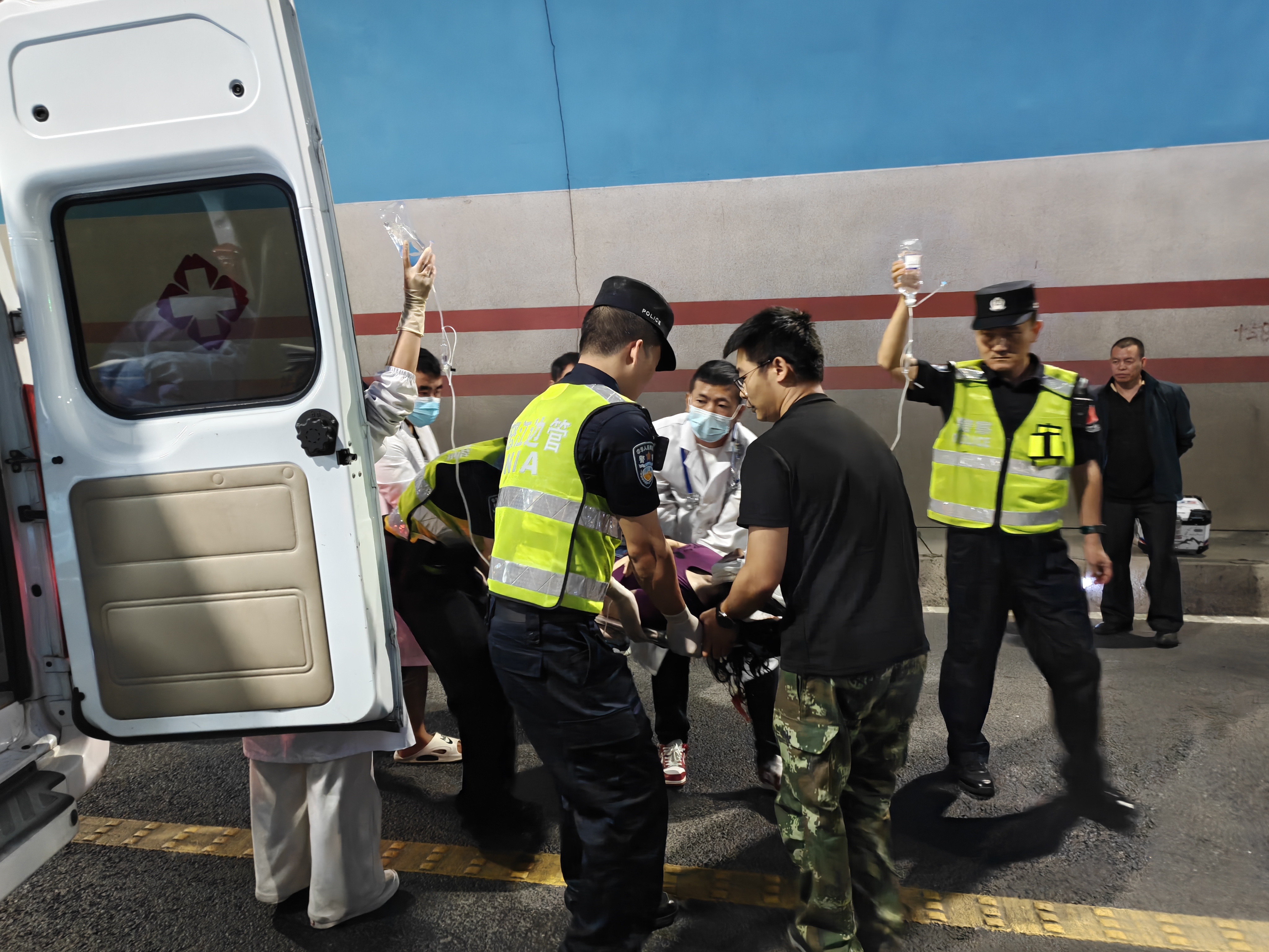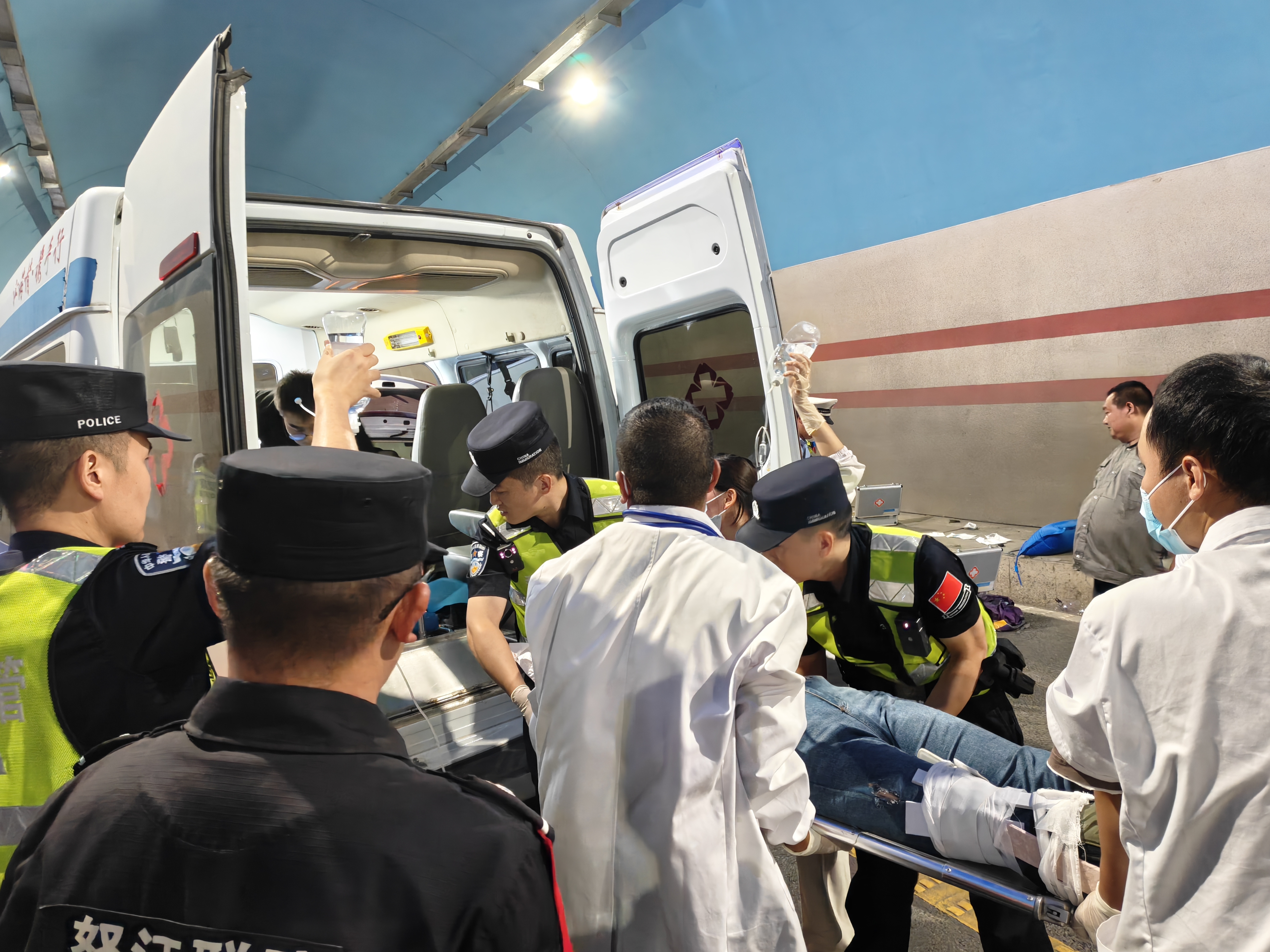 民警赵文达等人迅速冲进隧道,途中向所领导紧急汇报:“马吉乡街道隧道内交通事故,有人受伤,请求支援!”因隧道内手机信号中断,他立即跑出隧道拨通120急救中心电话,同步联系交警部门通报现场信息。抵达现场后,民警发现伤者蜷缩路边,头部地面有血迹,右腿疑似骨折。为防二次事故,民警安排联防员疏导隧道两端车辆,所部支援警力到达后,迅速布设反光锥形桶,在50米处设安全警戒区,疏导车辆绕行并提醒群众“注意安全,不要围观,保持通道畅通。”